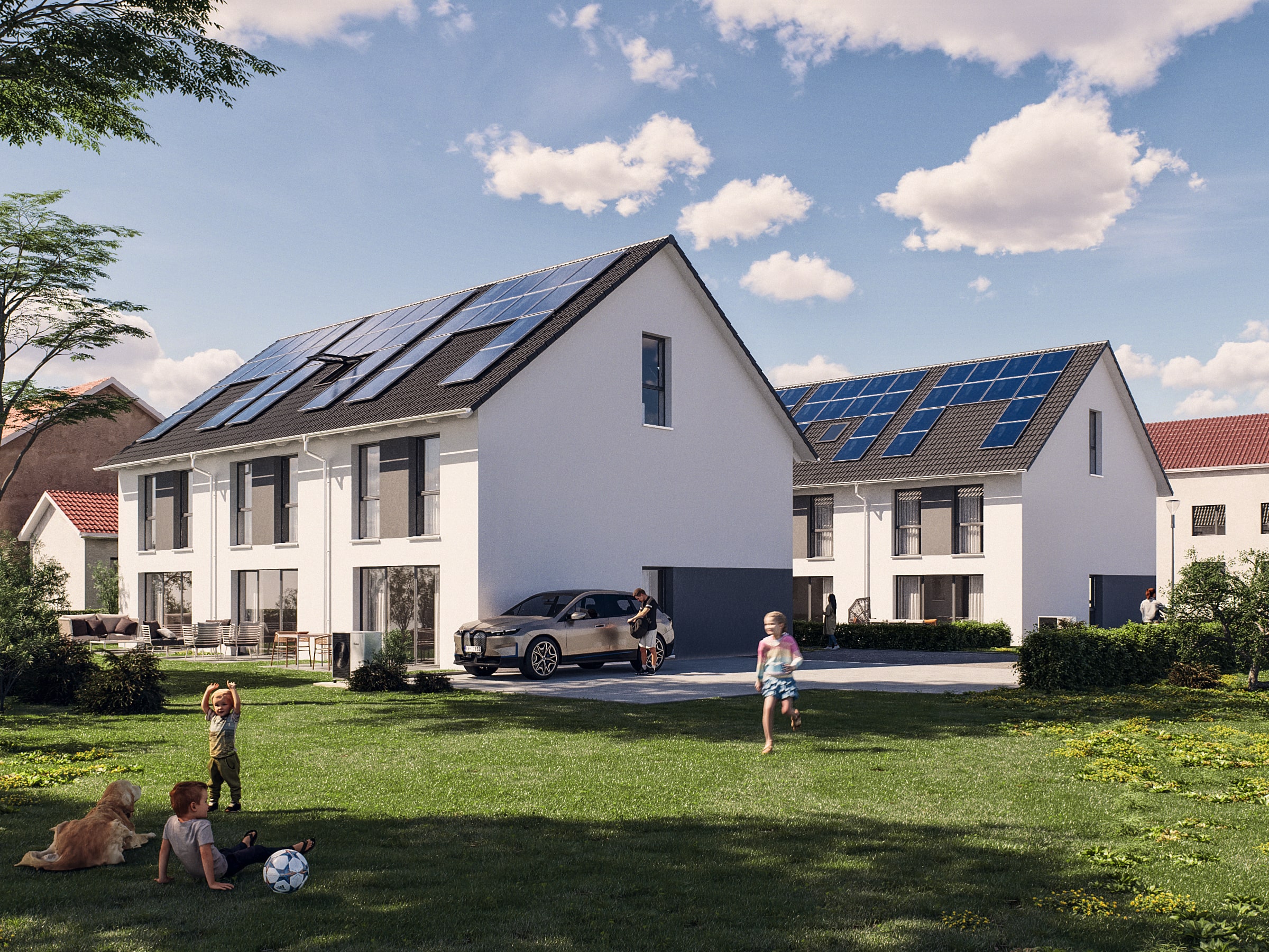 Die Gebäude werden nicht nur mit einer umweltfreundlichen Heiztechnik (Luft-Wasser-Wärmepumpe in Kombination mit Photovoltaik) ausgestattet und nach dem aktuellen Baustandard des GEG errichtet, sondern sind auch KfW-40 Standard mit QNG-Nachweis